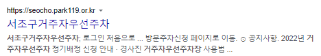 거주지 우선주차 신청 사이트 안내입니다. 먼저 자신이 거주하는 시군구청의 홈페이지를 통해서 신청하실 수 있는데요. 예를 들어 "서초구 거주자 우선주차" 이런 식으로 검색을 하면 해당 신청 사이트 바로가기 홈페이지가 나오는 것을 볼 수 있습니다