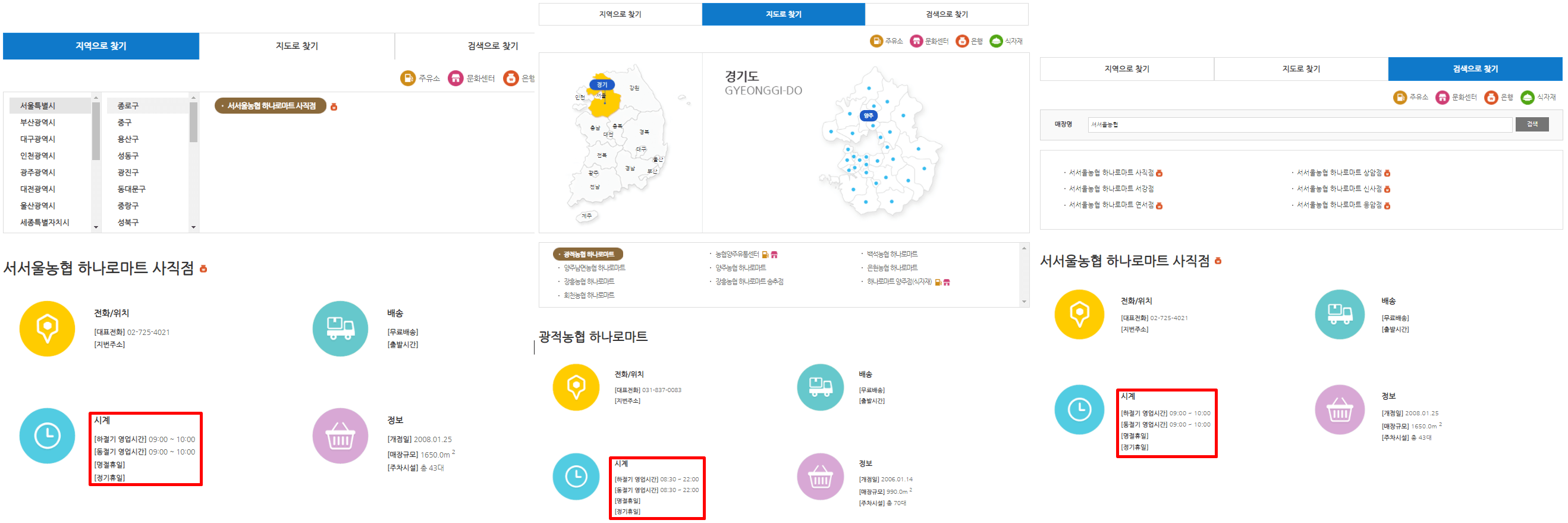 하나로마트 영업시간 및 휴무일에 대해 알아봤습니다. 위의 방법 외에도 네이버나 다음과 같은 검색 포털에 자신이 가고자 하는 하나로마트 이름만 검색해도 영업시간과 휴무일을 확인하실 수 있으니 편하신 방법으로 하시면 되겠습니다.