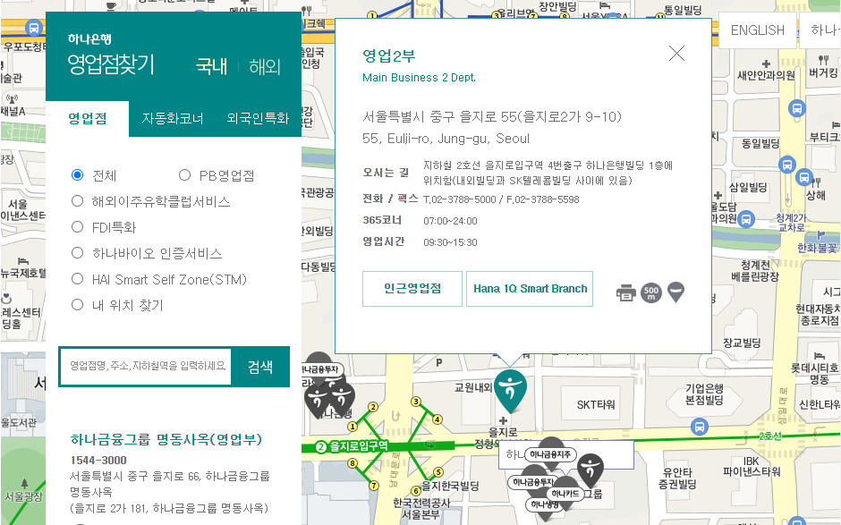 하나은행의 영업점 찾으면 해당 영업점의 영업시간을 함께 확인할 수 있습니다. 또한 주소 및 전화번호는 물론 365코너의 운영시간도 확인이 가능합니다.