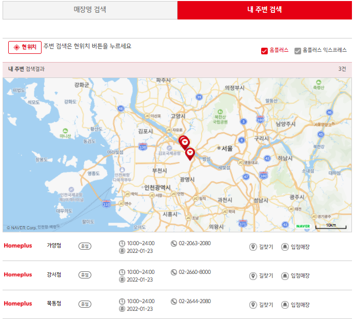 내 주변 검색을 통하시면 현재 나의 위치 주변의 홈플러스 정보와 영업시간에 대해서 확인하실 수 있습니다. 위치가 정확하지 않다면 현 위치 버튼을 통해 누르시면 확인이 가능합니다.