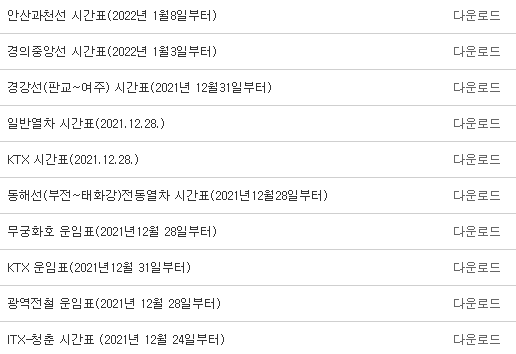 열차 시간표 및 운임까지 안내하고 있어 한눈에 보기 편합니다. 매번 수시로 업데이트가 되기 때문에 코레일 열차 운임 및 시간표 바로가기를 통해 확인을 하시거나 아래 자료를 이용하시면 ktx 열차 전 구간의 시간표를 보다 편리하게 확인하실 수 있습니다.